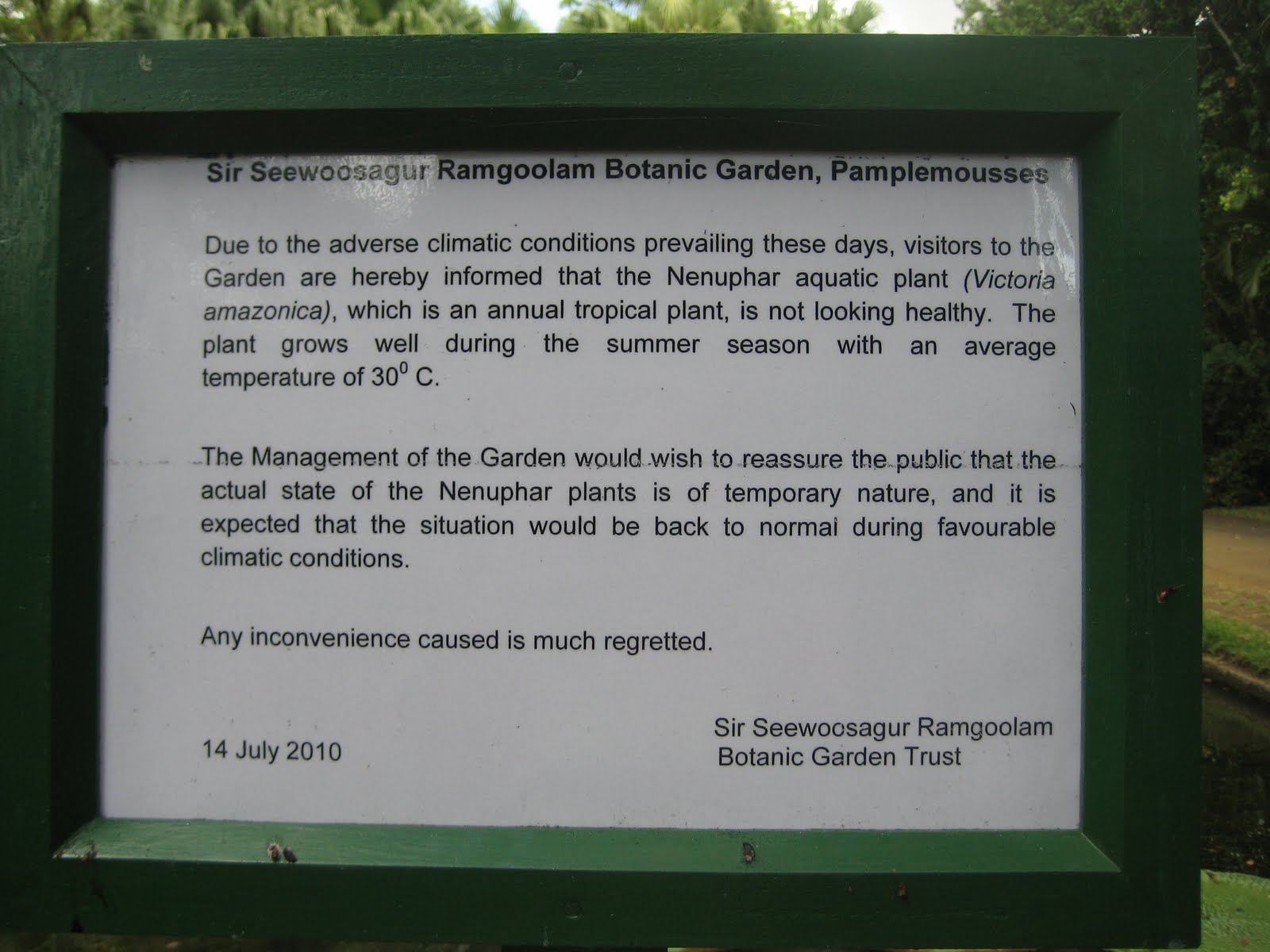 I was waiting to see this massive leaves for a long time; after seeing them on TV. What I saw disappointed me; the leaves were withered and were not as massive as they should be. Then I saw this notice put beside the pond.